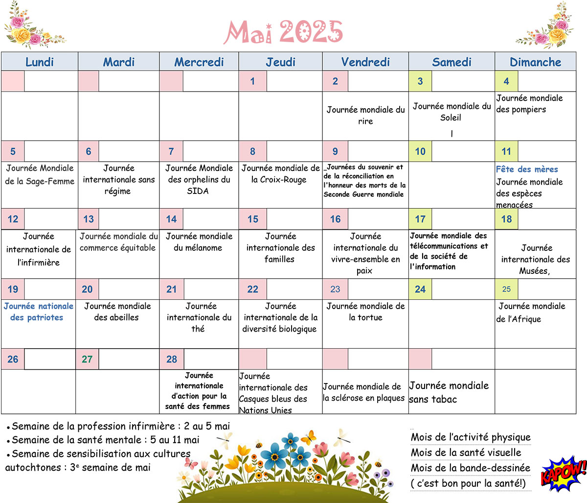 En mai, parlons santé En regardant le calendrier du mois de mai, de nombreuses journées sont consacrées à la santé et à des professions touchant aux soins. Certaines journées ne semblent pas s’adresser à la santé directement, comme la Journée mondiale du rire le 2 mai, la Journée mondiale du Soleil le 3 mai et la Journée internationale sans régime le 6. Mais, elles touchent toutesnotre bien-être physique ou psychologique. Ajoutons égalementque du 5 au 11 mai, c’est la semaine de la santé mentale. C’est grâce au docteur Madan Kataria1, l’inventeur du Yoga du Rire, qu’il y a des sessions...