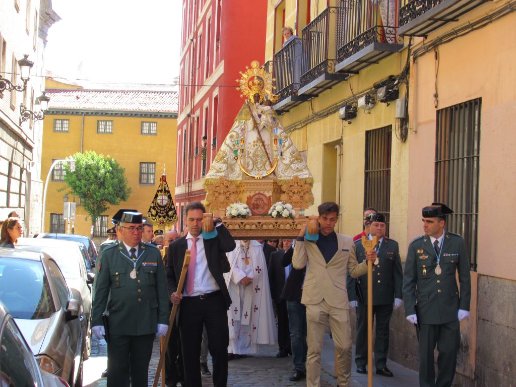Durant un de nos séjours à Madrid en nous promenant dans le quartier Centro nous remarquons une affiche annonçant une procession pour le dimanche suivant. Nous avions toutes les informations pertinentes, heure et lieu de départ ainsi que le parcours. Dimanche matin, nous sommes en face du Monasterio de Nuestra Señora de Montserrat (Monastère de Notre-Dame de Montserrat) et attendons le départ avec un groupe de curieux. Plusieurs personnes s’affairent à l’entrée de l’église, des hommes et des femmes de tous âges habillés de leurs plus beaux atours. Un orchestre attend le signal.