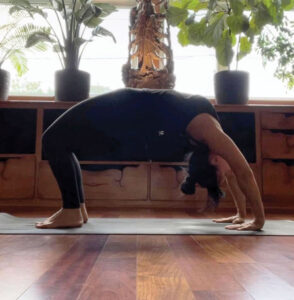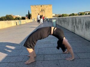 Je vous inclus ici une photo de Dhanurasana, le pont, prise lors d’un de mes voyages en Espagne à l’automne 2024. J’adore pratiquer des postures de yoga en voyage, simplement pour le plaisir. Combiner mes deux passions, le yoga et le voyage, crée toujours quelque chose de magique en moi. Lorsqu’on est en voyage et qu’on fait des postures, nous n’avons habituellement pas le temps de bien réchauffer notre corps. C’est là où l’on peut observer la différence dans la posture, que ce soit en hauteur ou en force visuelle. Cela reste pour moi une belle manière de partager mes deux passions à travers cette expérience à la fois personnelle et joyeuse.