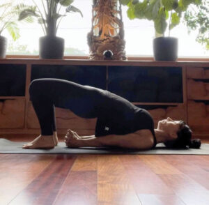 Allongez-vous sur le dos, genoux pliés et pieds à plat au sol, talons près du bassin. Gardez les cuisses proches l’une de l’autre. Sur une expiration, poussez dans vos pieds pour soulever le bassin. Entrelacez les doigts derrière le dos et roulez les épaules sous vous pour rapprocher les omoplates. Poussez les avant-bras dans le sol et continuez de soulever le bassin, en maintenant la force dans les jambes.