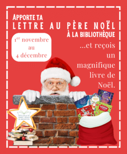 D’ici le 4 décembre, apporte ta lettre au Père Noël à la bibliothèque et tu pourras choisir un de nos magnifiques livres de Noël.